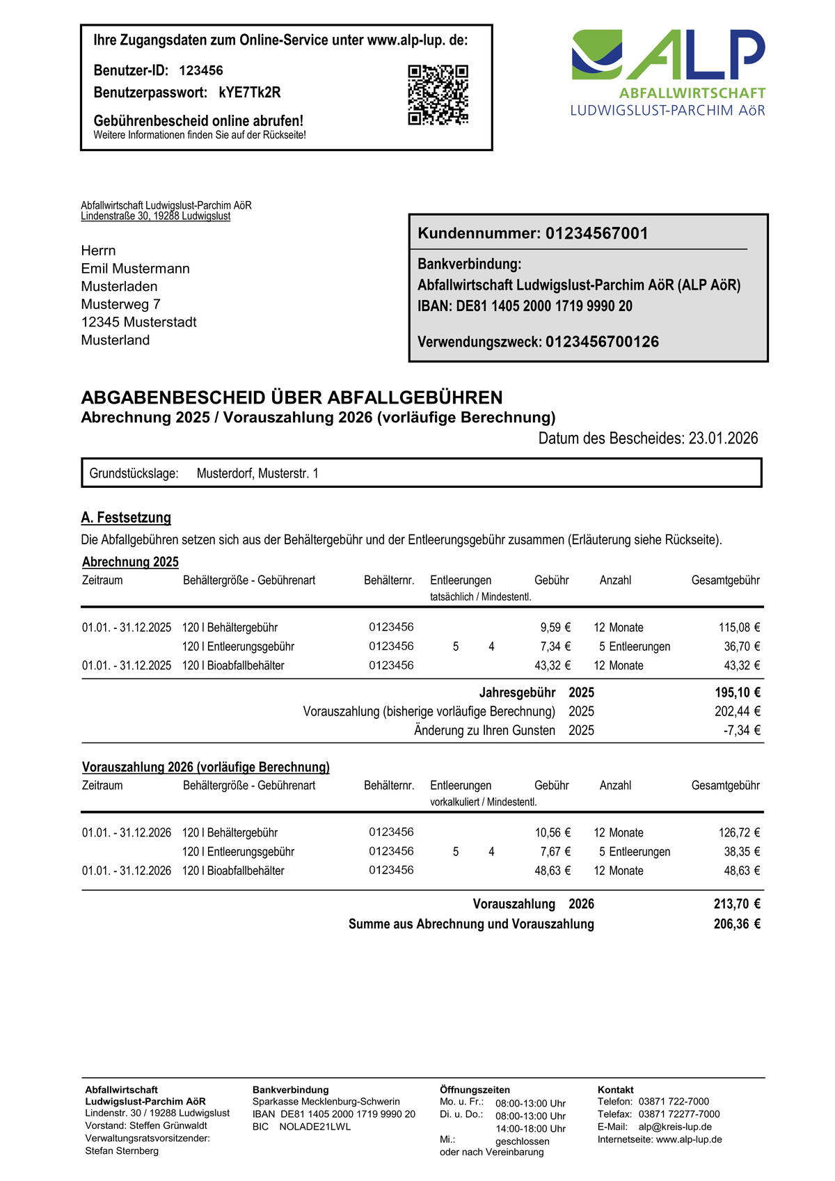 Über 80.000 Gebührenbescheide der Abfallwirtschaft Ludwigslust-Parchim AöR werden in den nächsten Tagen den Grundstückseigentümern und -verwaltungen, Firmen und öffentlichen Einrichtungen im Landkreis zugestellt. Die Gebührenbescheide beinhalten die Abrechnung der Abfallgebühren für das Jahr 2025 und die vorläufige Berechnung der Gebühren für das Jahr 2026.